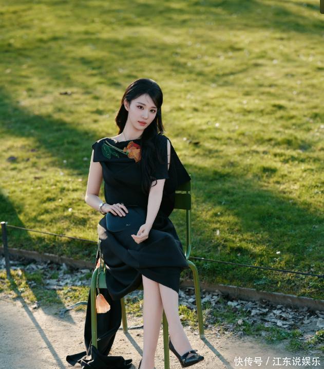 如果说机场造型是她递出的时尚名片,那3月3日秀场的黑色斜裁长裙,就是她敲开顶奢大门的钥匙。哑光黑裙上的橙红立体花饰,像暗夜里燃烧的火焰,露背设计露出的光滑美背,在闪光灯下泛着珍珠般的光泽。当她戴着四叶草墨镜回眸的瞬间,外媒直接用“复古油画里走出的东方大小姐”来形容她。